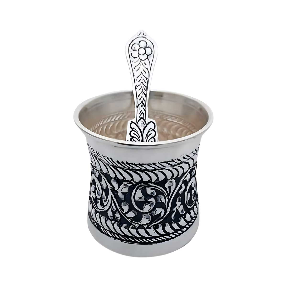 Exquisite silver Gangajal container with finely carved spoon,A divine piece of art for sacred rituals.The Exquisite silver Gangajal container and spoon featuring intricate carvings. The fine details showcase exceptional craftsmanship, adding elegance to sacred rituals. A divine blend of artistry and functionality.