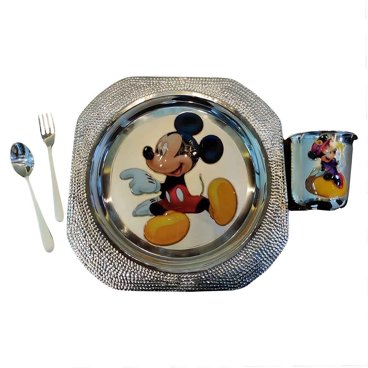 Charming silver Mickey dinner set for kids, adorned with playful dots. Delightful tableware for young ones, making mealtime extra special.